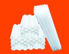1、打开斜管填料包装,将片斜管填料平放于地面,取第二片斜管填料置于片填料之上,检查斜管填料的切口需保证60°角、并呈六角蜂窝状检查无误后开始烫接粘接点;