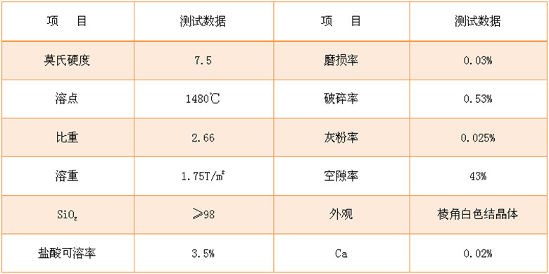 石英砂滤料是一种坚硬、耐磨、化学性能稳定的硅酸盐矿物,其主要矿物成分是SiO2,石英砂的颜色为乳白色、或无色半透明状,呈多棱型球状的白色结晶体,硬度7,性脆无解理,贝壳状断口,油脂光泽,密度为2.65,堆积密度(1-20目为1.6),20-200目为1.5,其化学、热学和机械性能具有明显的异向性,不溶于酸,微溶于KOH溶液,熔点1750℃。