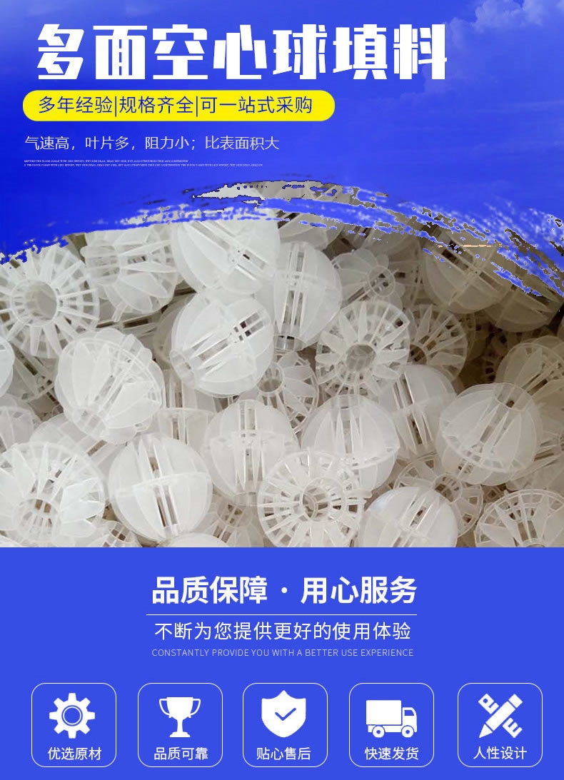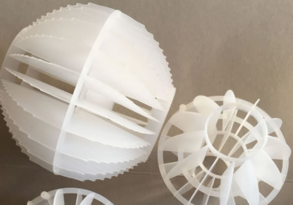 多面空心球采用聚丙烯(PP)塑料制成球状,由两个半球合成一个球形,每个半球上根据设计需要有8-12个半扇形叶片,两个半球的扇形叶片相互错开。该填料特点是比表面积大,空隙率较高。但是由于叶片数偏多,彼此间有遮蔽效应,不利于液体分布和润湿;液体大多在球体空心柱聚集,阻碍气体畅通,因此阻力较大。此种填料多用于废气处理和水处理工程