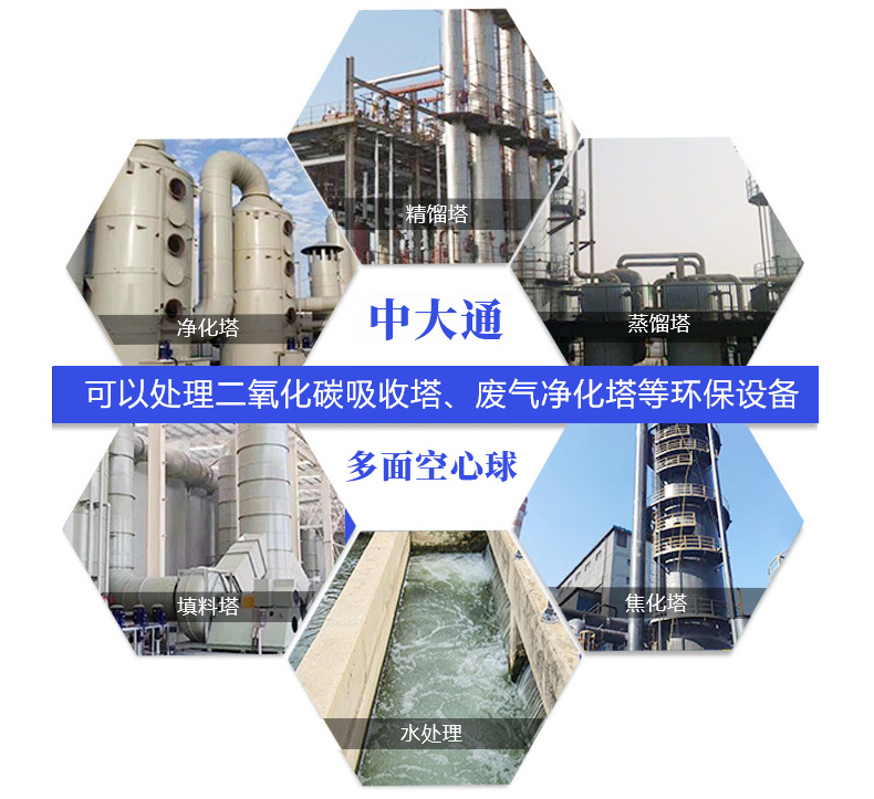 多面空心球广泛应用于除氯气、除氧气、除二氧化碳吸收塔、废气净化塔、酸雾净化塔等环保设备中。