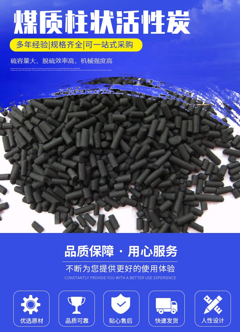煤质柱状活性炭用于有毒气体的净化,废气处理,工业和生活用水的净化处理,溶剂回收等方面。并且广泛应用于工农业生产的各个方面,如石化行业的无碱脱臭(精制脱硫醇)、乙烯脱盐水(精制填料)、催化剂载体(钯、铂、铑等)、水净化及污水处理;电力行业的电厂水质处理及保护;化工行业的化工催化剂及载体、气体净化、溶剂回收及油脂等的脱色、精制;食品行业的饮料、酒类、味精母液及食品的精制、脱色;黄金行业的黄金提取、尾液回收;环保行业的污水处理、废气及有害气体的治理、气体净化;以及相关行业的香烟滤嘴、木地板防潮、吸味、汽车汽油蒸发污染控制,各种浸渍剂液的制备等。活性炭在未来将会有很 好的发展前景和广阔的销售市场。