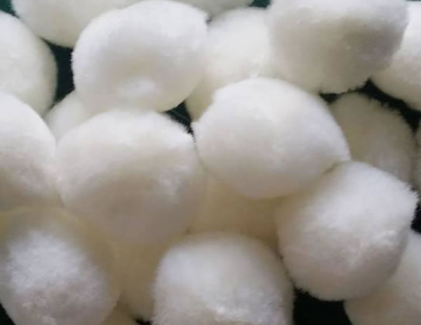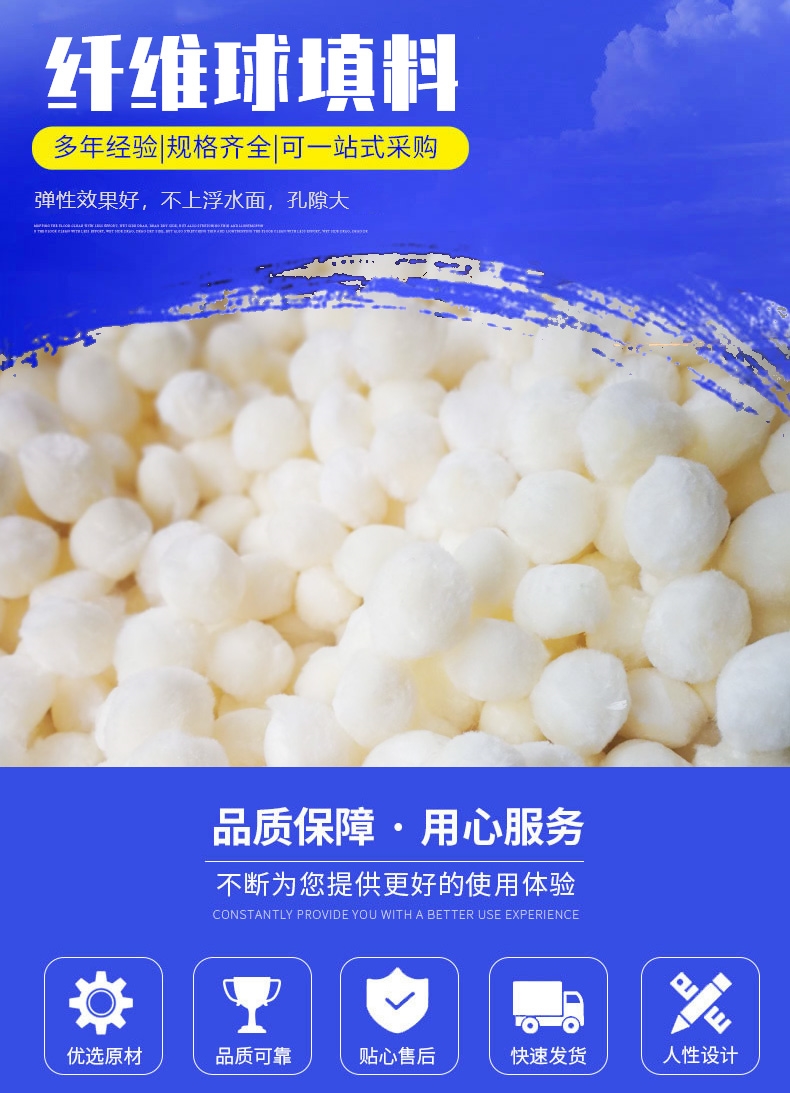 纤维球选用高醛化维呢纶,定型涤纶丝为原料。用自身表面所沾附的大量生物团与充氧,污水反复接触,使废水中的悬浮物及有机物降解而达到处理目的。